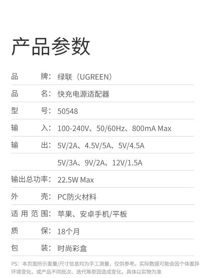 商品名稱(chēng):綠聯(lián) 22.5W超級(jí)快充頭 適用華為充電器榮耀小米USB數(shù)據(jù)線插頭