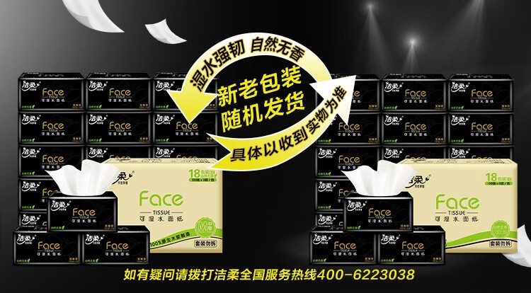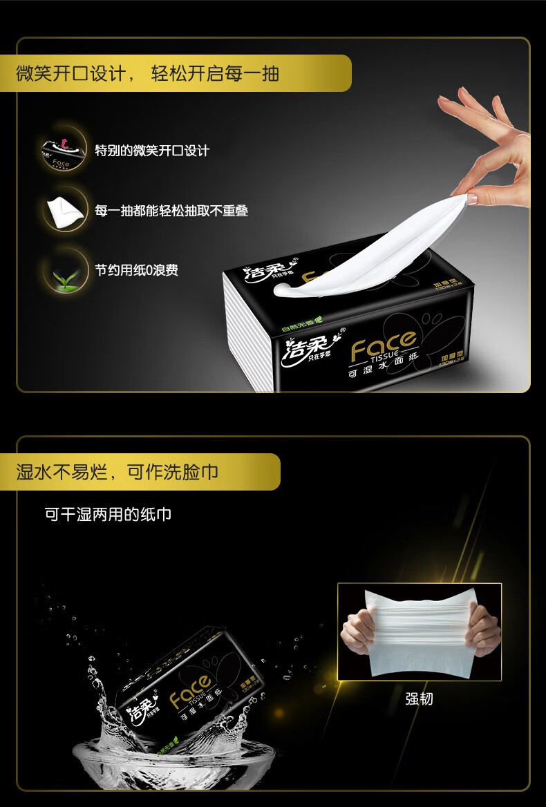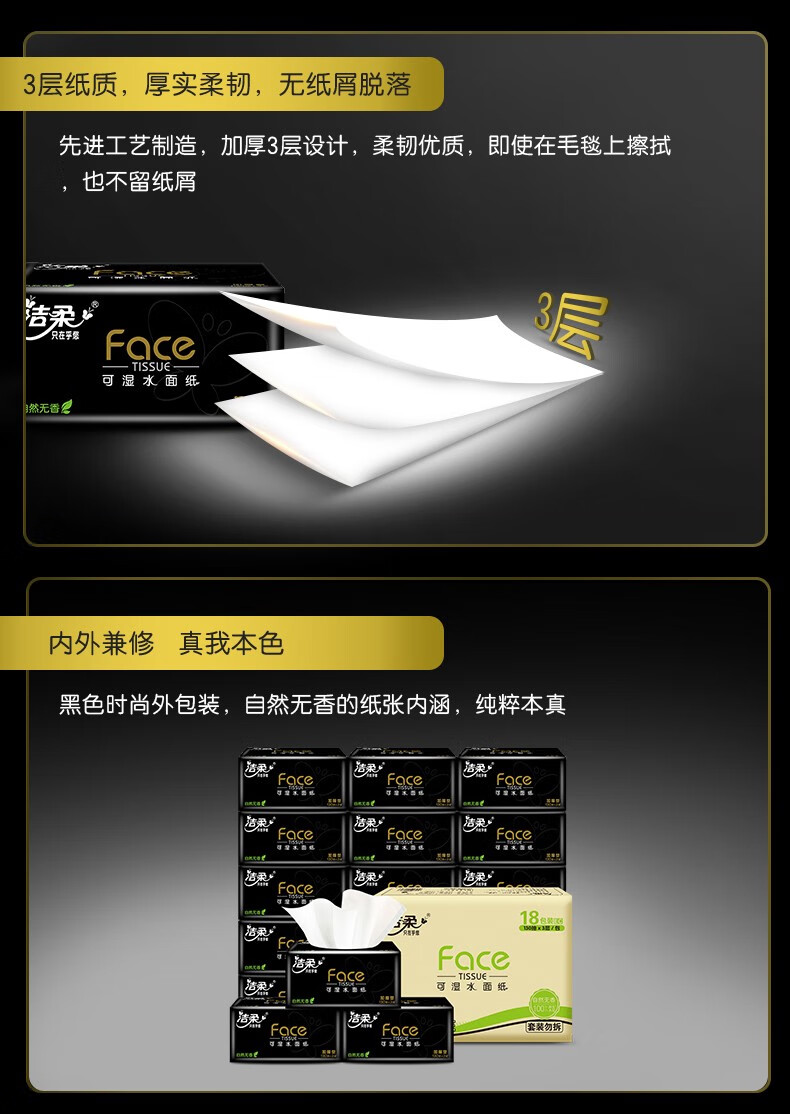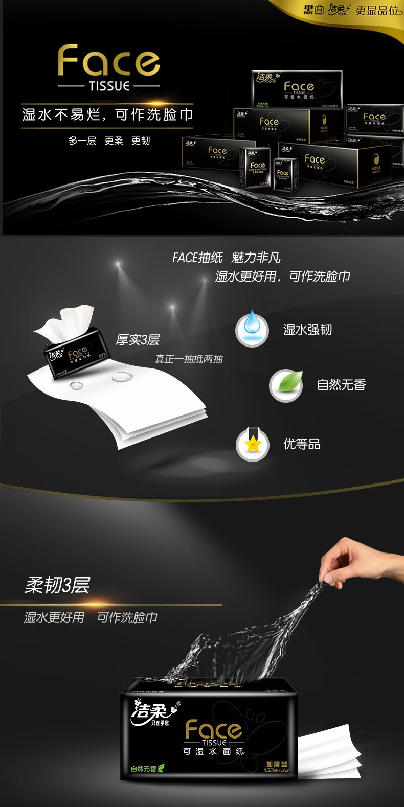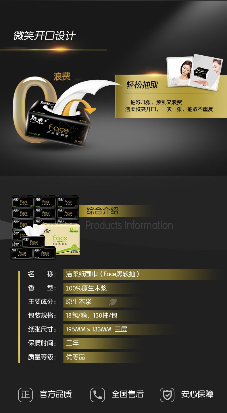 商品名稱:潔柔 抽紙 黑Face3層130抽*18包 濕水強(qiáng)韌 自然無(wú)香面巾紙 整箱