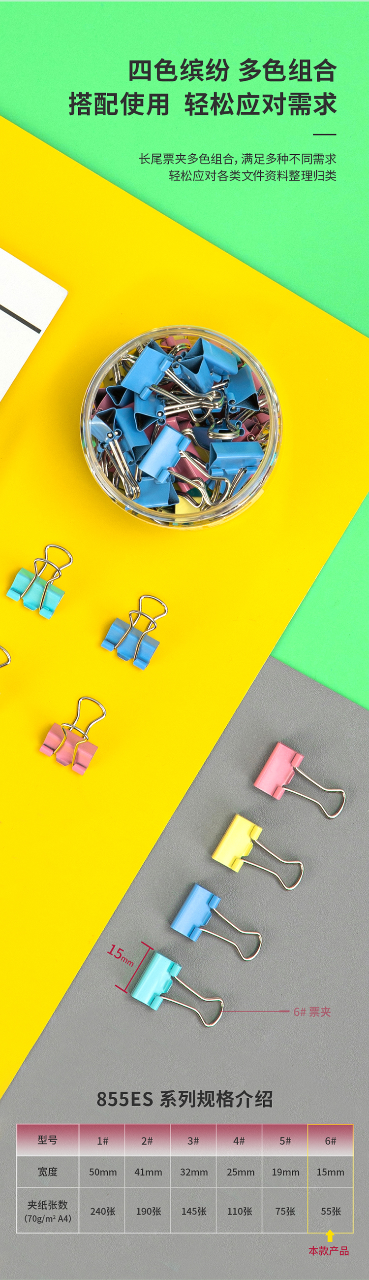 商品名稱:得力8556ES 彩色長尾夾 6#15mm小號金屬票夾燕尾夾票據(jù)文件夾子 辦公用品 60只/筒
