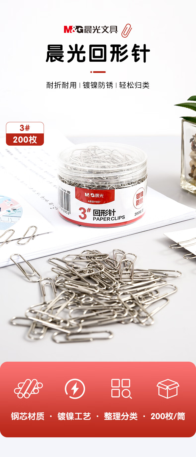 商品名稱:晨光ABS91697 鍍鎳回形針 3#金屬防銹曲別針 辦公用品 200枚/盒