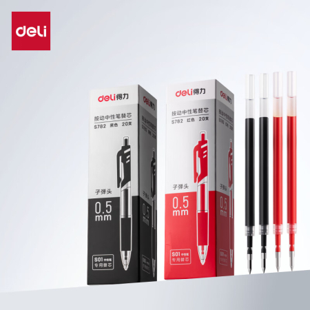 商品名稱:得力S782 按動中性筆芯替芯 S01/S08/1008/K35適用 0.5mm子彈頭 20支/盒 辦公用品