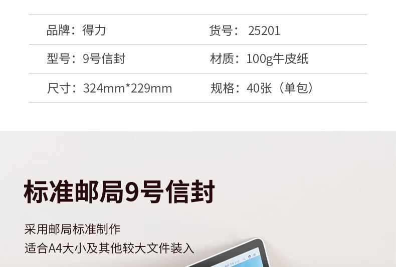 商品名稱:得力25201 牛皮紙大信封 9號A4郵局標準信封229*324mm 40張/包