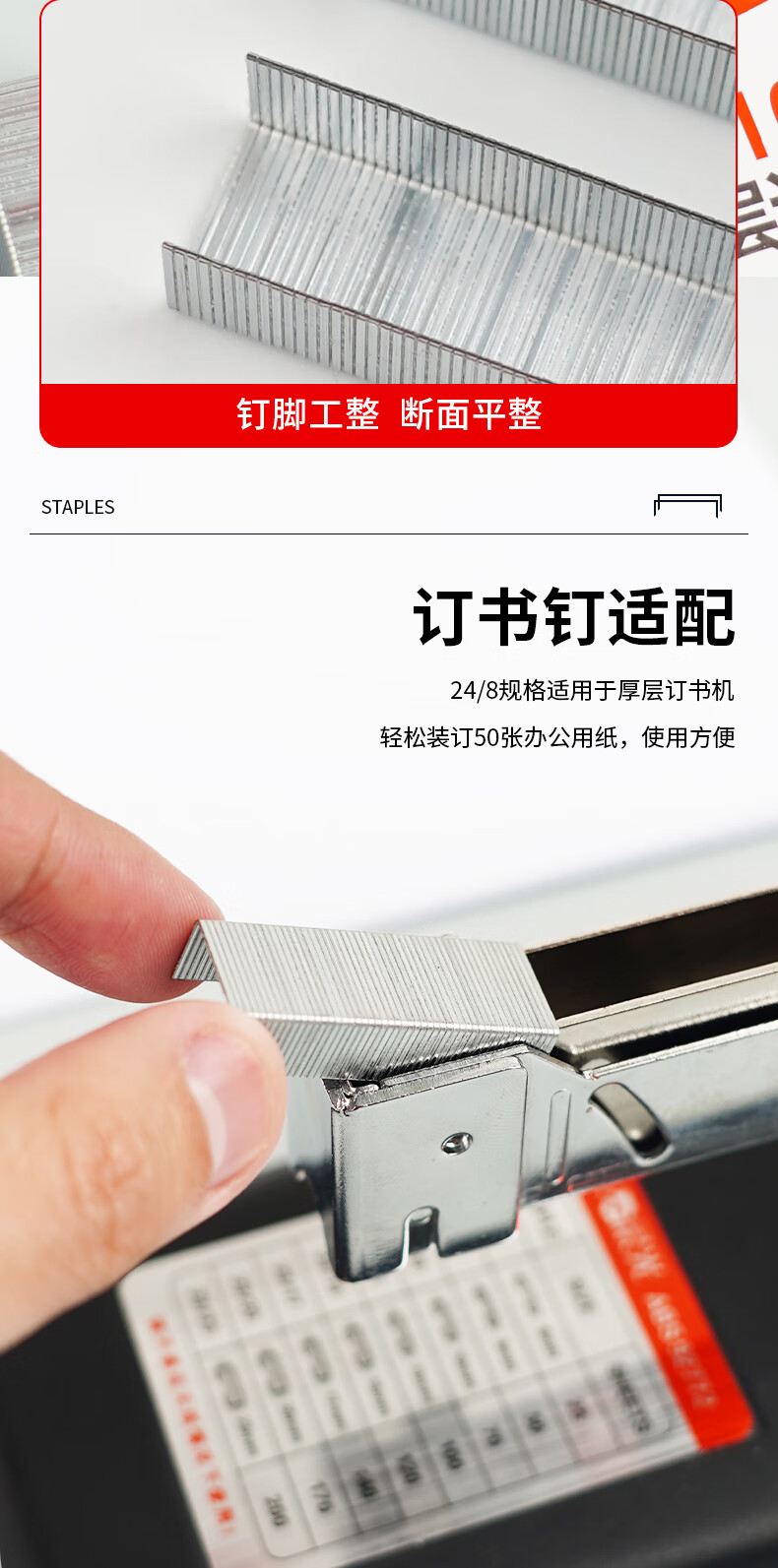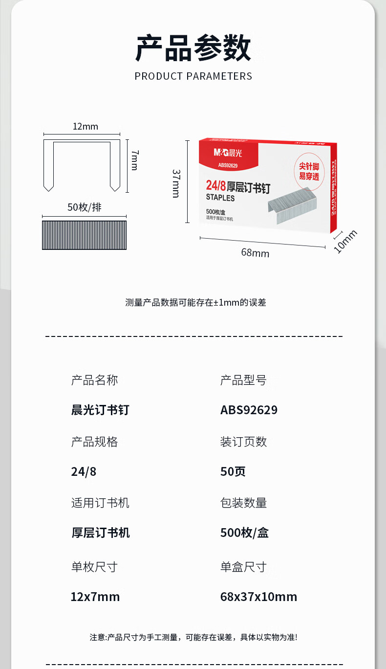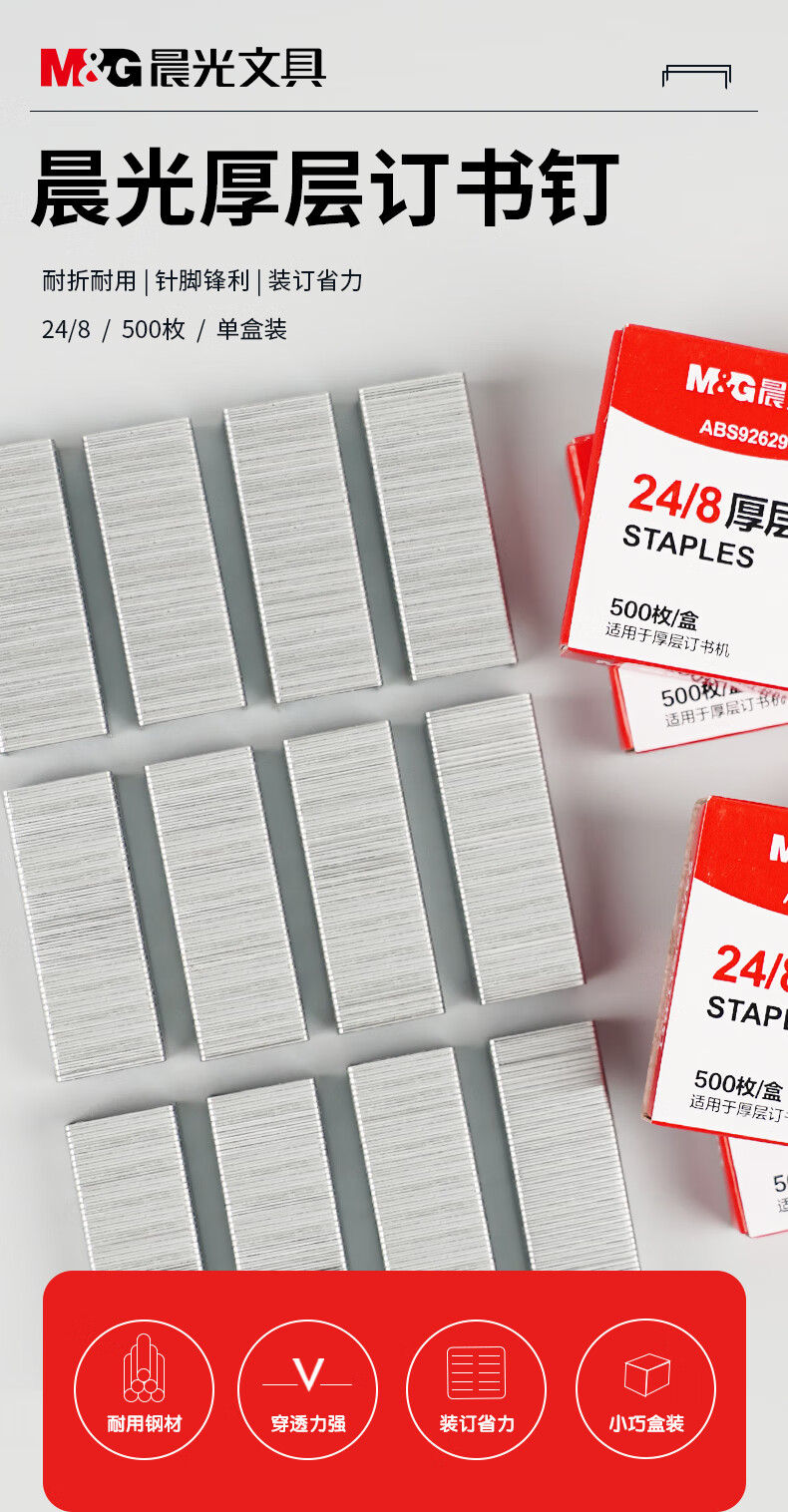 商品名稱:晨光ABS92629 訂書釘 24/8號厚層易穿透訂書針 辦公用品 500枚/盒 單盒裝