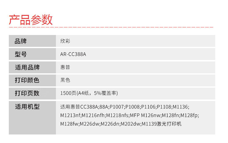 商品名稱:欣彩AR-CC388A大眾版硒鼓 適用惠普CC388A HP P1007 1008 M128fn 黑色 1500頁(yè)(計(jì)價(jià)單位:支)