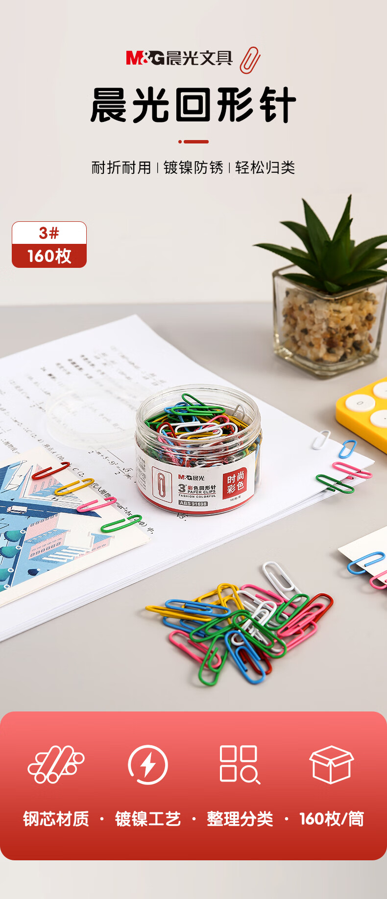 商品名稱:晨光ABS91698 彩色回形針 3#防銹多功能曲別針 160枚/筒