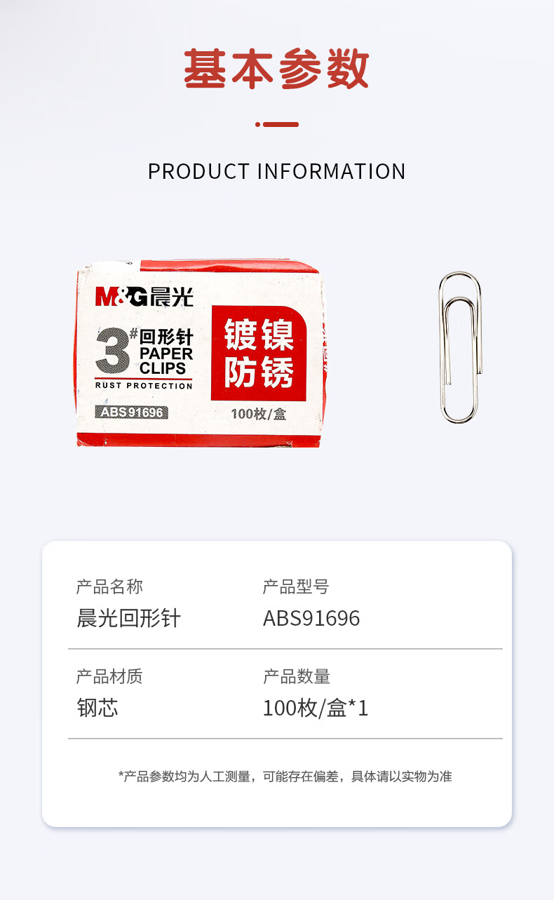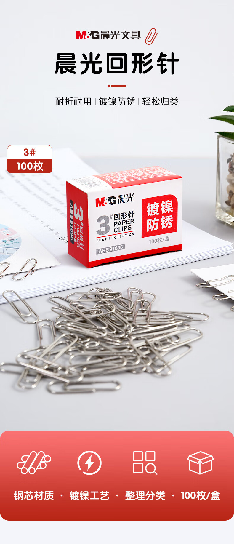 商品名稱:晨光ABS91696 鍍鎳回形針 3#金屬防銹曲別針 辦公用品 100枚/盒