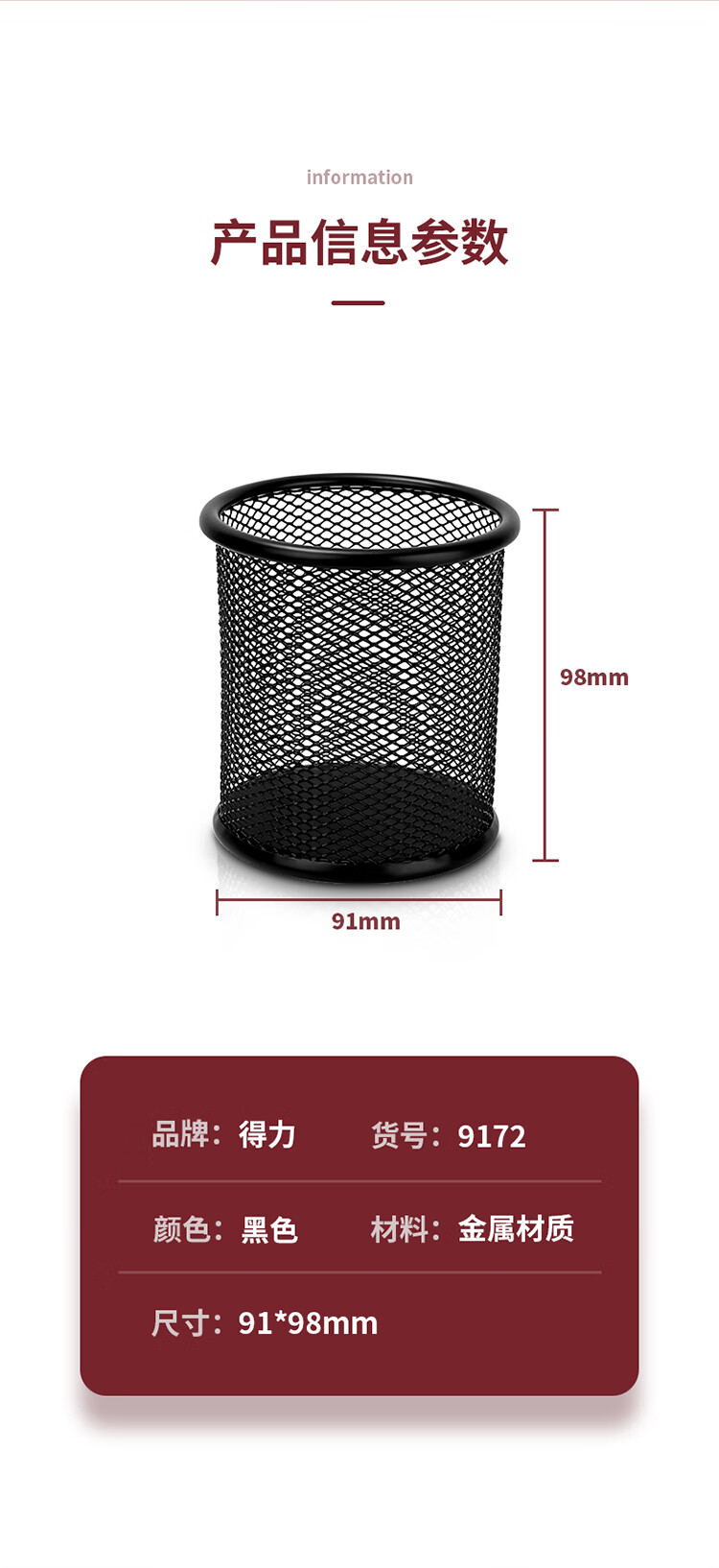 商品名稱(chēng):得力9172 金屬網(wǎng)紋圓形筆筒 簡(jiǎn)約創(chuàng)意桌面收納盒 辦公用品 黑色 單個(gè)裝