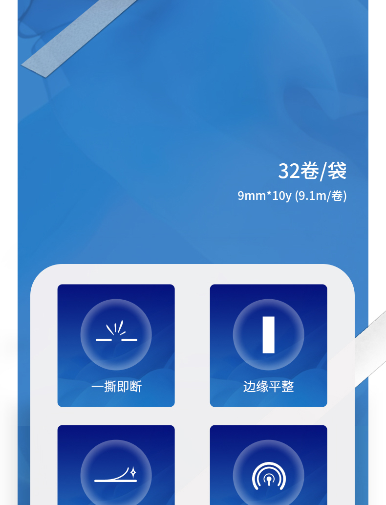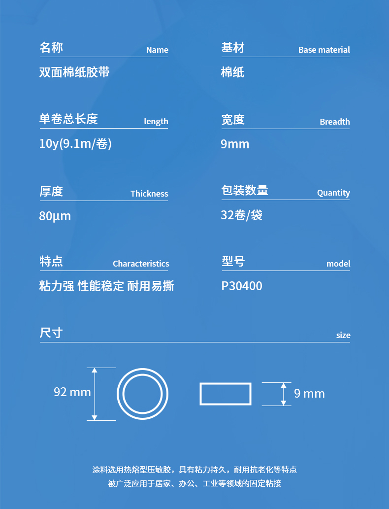 商品名稱:得力30400 高粘棉紙雙面膠帶 9mm*10y白色 32卷/袋