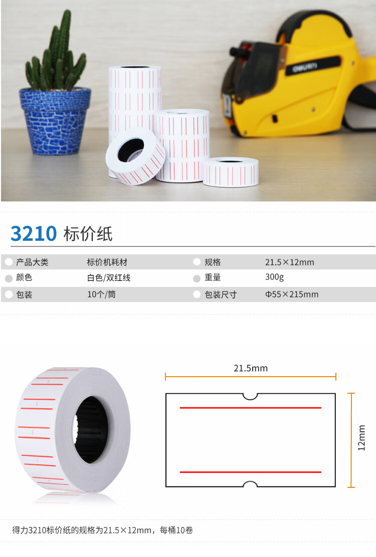 商品名稱:得力3210 單排標(biāo)價紙 21.5*12mm通用價格標(biāo)簽紙 10卷/筒
