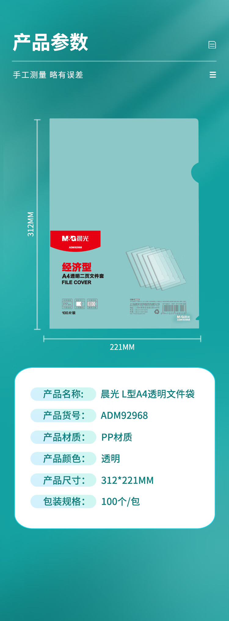 商品名稱:晨光A4透明L型文件袋 防塵防水單片夾資料保護(hù)袋 100片/包ADM92968