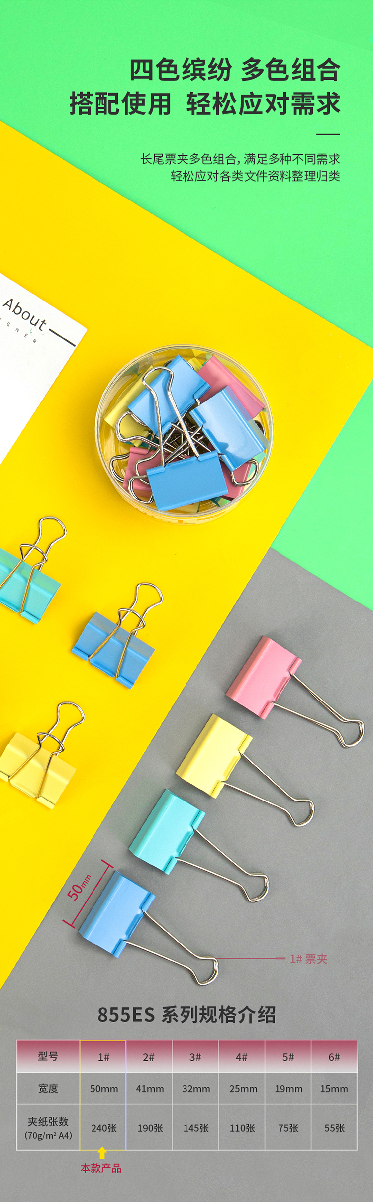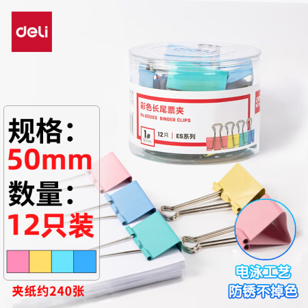 商品名稱(chēng):得力8551ES 彩色長(zhǎng)尾夾 1#50mm超大號(hào)金屬票夾燕尾夾票據(jù)文件夾子 辦公用品 12只/筒